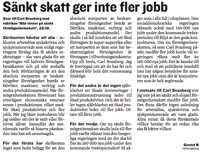 Gustaf B, jag säger inte detta för att vara elak, men du borde nog studera lite grundläggande nationalekonomi. Det finns många bra böcker i ämnet. En bra början är Henry Hazlitts Economics in One Lesson.